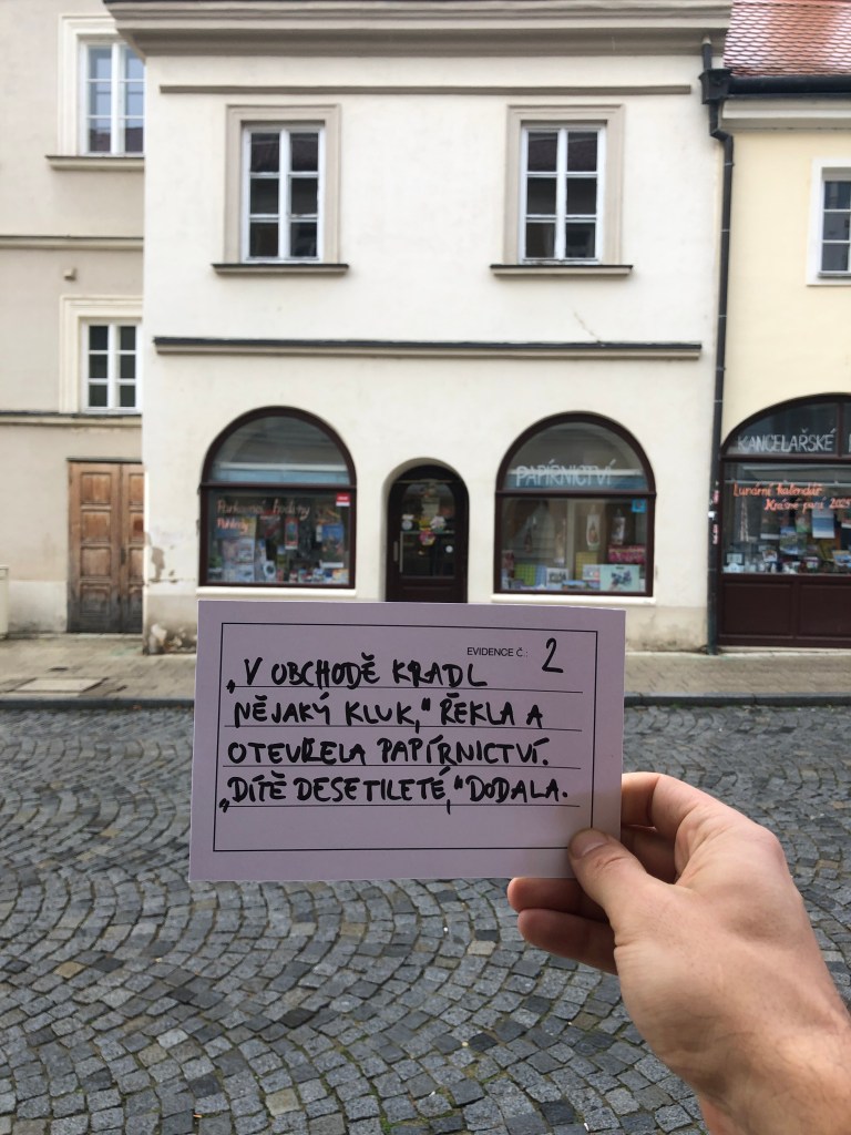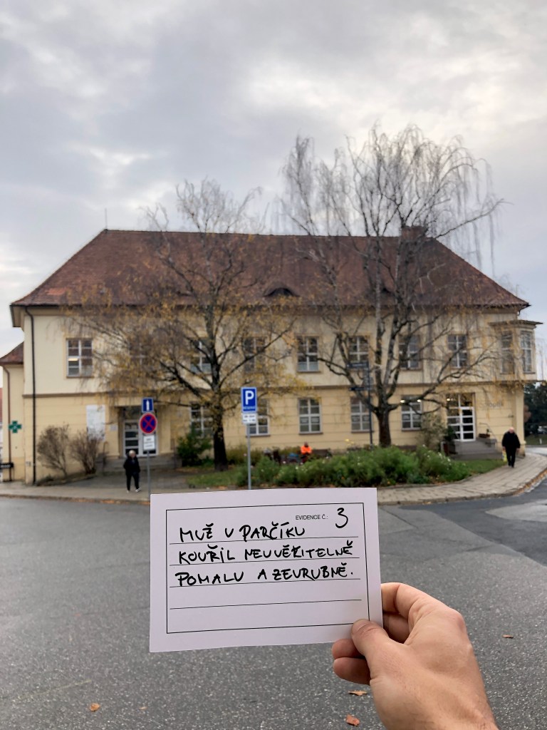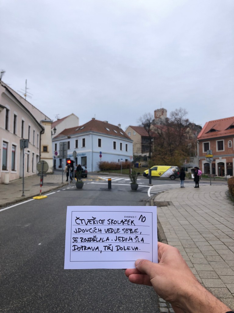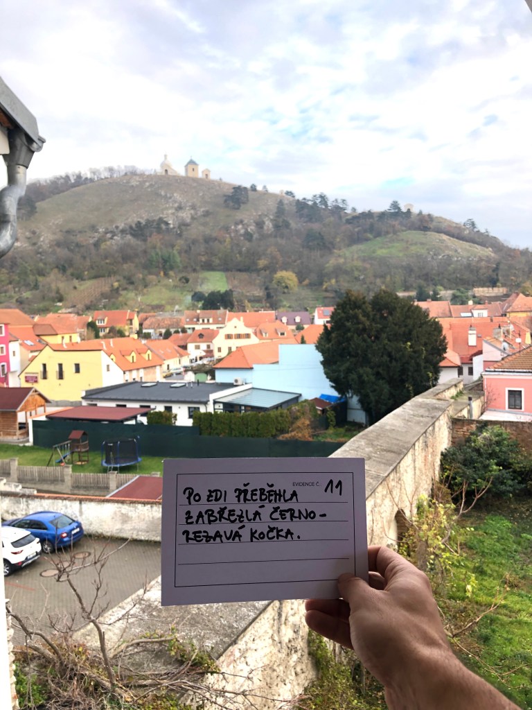 Výsledek téhle změny stavu se dostavil v nečekaných formách. Jednak v tu chvíli začaly být příběhy, i jejich nejefemérnější stopy v podobě drobných momentů v mikulovských ulicích, příjemným osvěžením, cvrkotem pro oči toho, kdo je konečně může a chce pozorovat a zaznamenat. A tak vznikla ta malá série fotodokumentačních záznamů, kterou ti posílám v příloze. Druhým efektem bylo, že jsem měl najednou chuť do těch efemér vstoupit a dění v uličkách rozčísnout nějakou hrou, která by se beze mě v Mikulově nestala. Zní to možná trochu zpupně, ale to je přece důvod, proč si nás do Mikulova zvete, ne? Na dvorku před naším ubytováním zůstala větev, kterou jsem našel v křoví u dětského bunkru skrytého na úpatí Svatého kopečku a kterou jsem původně chtěl použít ve štukovém sále pro naše čtení s Elenou. Ale předběhls mě a přinesl jinou. Moje větev na dvorku překážela, já ti svatosvatě slíbil že ji odklidím. A tak se z ní stala nabídka na absurdní příběh v youtuberském duchu, který dostal jméno snad díky Eleně nebo jejímu klukovi Vojtovi, už nevím. Jmenuje se to „Navracení klacku do volné přírody“. To ti pošlu odkazem přes wetransfer, ty data jsou objemný.