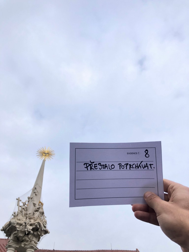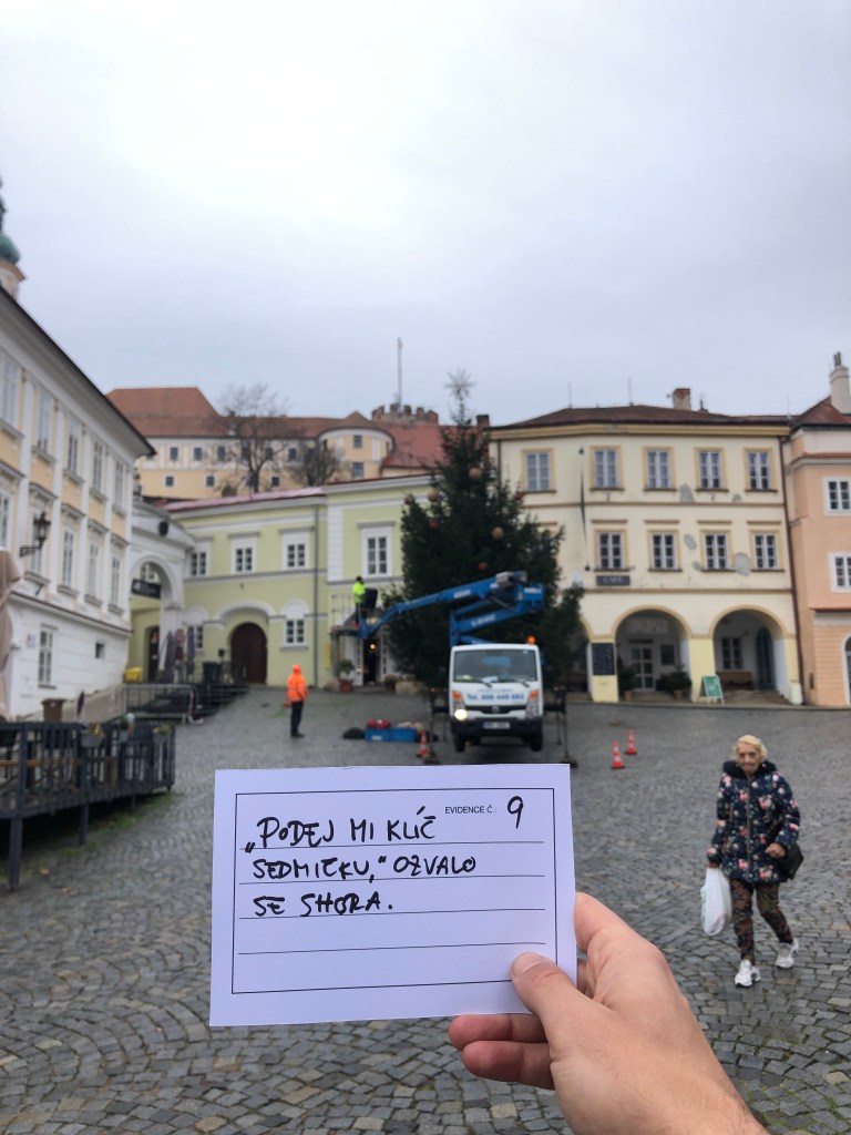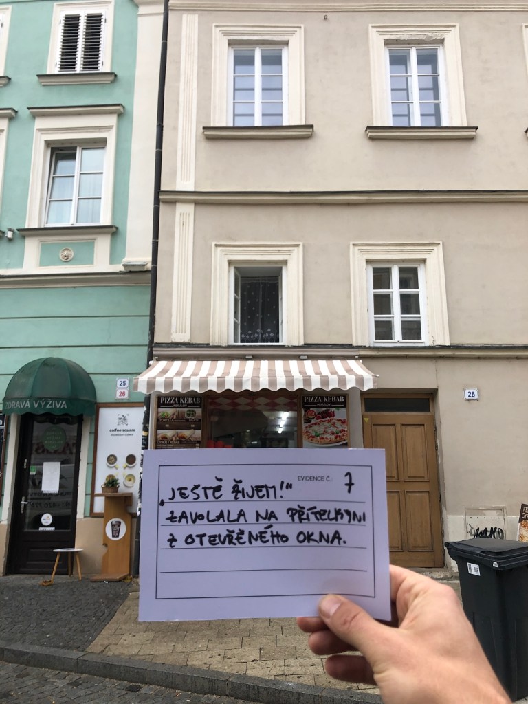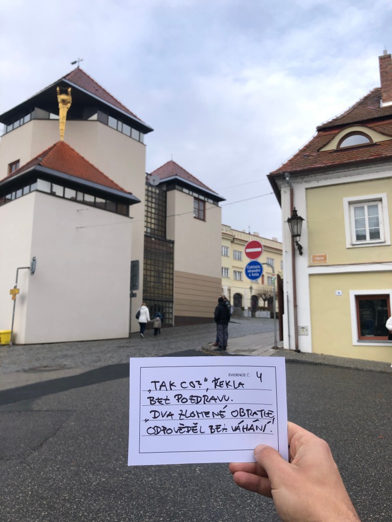 Výsledek téhle změny stavu se dostavil v nečekaných formách. Jednak v tu chvíli začaly být příběhy, i jejich nejefemérnější stopy v podobě drobných momentů v mikulovských ulicích, příjemným osvěžením, cvrkotem pro oči toho, kdo je konečně může a chce pozorovat a zaznamenat. A tak vznikla ta malá série fotodokumentačních záznamů, kterou ti posílám v příloze. Druhým efektem bylo, že jsem měl najednou chuť do těch efemér vstoupit a dění v uličkách rozčísnout nějakou hrou, která by se beze mě v Mikulově nestala. Zní to možná trochu zpupně, ale to je přece důvod, proč si nás do Mikulova zvete, ne? Na dvorku před naším ubytováním zůstala větev, kterou jsem našel v křoví u dětského bunkru skrytého na úpatí Svatého kopečku a kterou jsem původně chtěl použít ve štukovém sále pro naše čtení s Elenou. Ale předběhls mě a přinesl jinou. Moje větev na dvorku překážela, já ti svatosvatě slíbil že ji odklidím. A tak se z ní stala nabídka na absurdní příběh v youtuberském duchu, který dostal jméno snad díky Eleně nebo jejímu klukovi Vojtovi, už nevím. Jmenuje se to „Navracení klacku do volné přírody“. To ti pošlu odkazem přes wetransfer, ty data jsou objemný.